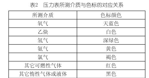 另外,根據(jù)壓力表所測介質(zhì)不同,壓力表應(yīng) 采用不同的色標(biāo),并注明所測介質(zhì)的名稱,詳見 表2。