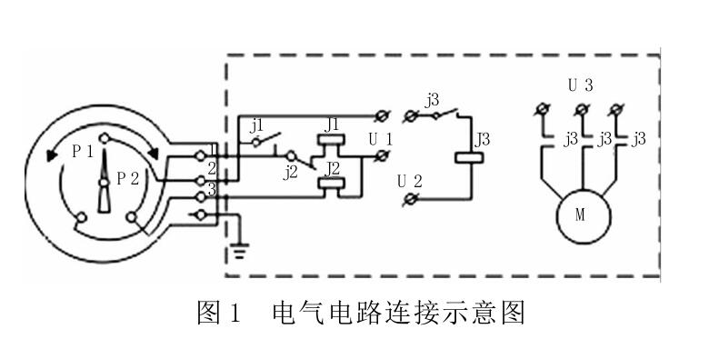 電接點壓力表是由彈簧管壓力表加裝電氣接點 所組成,除就地指示外,還用于發出壓力越限信號。它 的測壓原理是基于測量系統中的彈簧管在被測介質 的壓力作用下,迫使彈簧管末端產生相應的彈性變形 (位移),由固定齒輪上的指針將被測值在度盤上指示 出來;與此同時,帶動接點觸頭產生相應的動作(閉合 或斷開以使控壓系統中的電路得以接通或斷開’從而 實現自動控制報警和現場指示的目的。電氣電路連接如圖1所示。