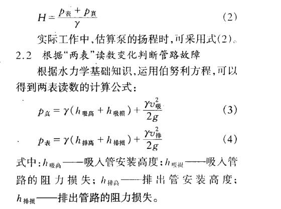 實際工作中,估算泵的揚程時,可采用式(2), 2.2根據“兩表”讀數變化判斷管路故障