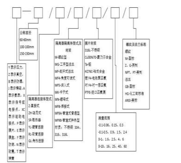 1.1.5壓力表的型號表示方法:例如:型號為Y-100/1.6/M的壓力表,表示的是普通壓 力表、表盤直徑100mm、壓力等級為1.6MP、國標螺紋。