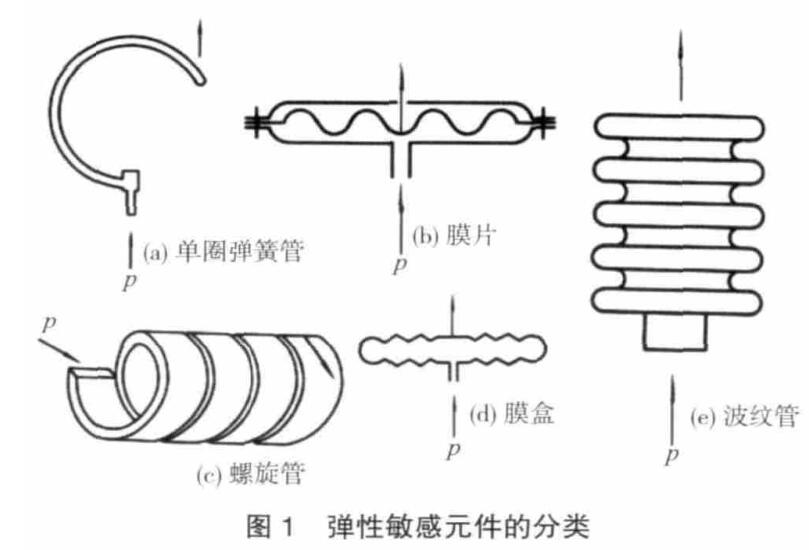 根據彈性敏感元件形狀的不同,可以將其分為 彈簧管式(單圈彈簧管和多圈彈簧管即螺旋管)、膜 片式、膜盒式和波紋管式,圖1為彈性敏感元件的 分類。