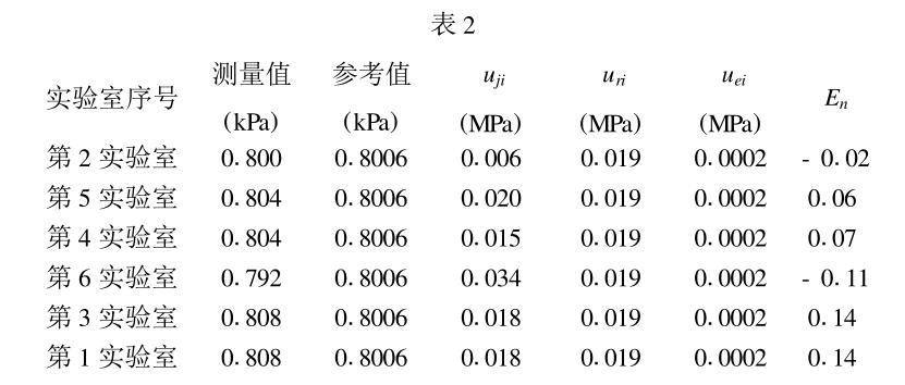 根據(jù)本次實施方案規(guī)定:本次比對以主導(dǎo)實驗室的 量值作為參考值(主導(dǎo)實驗室0. 01活塞式壓力計標(biāo)準(zhǔn)裝 置2011年8月下旬送上級計量機構(gòu)檢定,準(zhǔn)確度高、穩(wěn) 定性較好)Yri = 0. 8006 , ud = 0. 019 MPa , uei = 0. 0002 MPa 5.2比對結(jié)果的評價