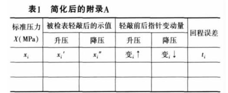 在此僅就與操作有關的項目進行闡述。附錄A中, 有被檢表的分度值(設為6),有與被檢表準確度等級有 關的允差范圍(設為±5),有升壓和降壓時的被檢表輕敲 后示值(設為x/和x,"),有輕敲前后被檢表的指針變動量 (設為變,丨、變,丨),有回程誤差(設為t),簡化的附錄A 如表1所示。
