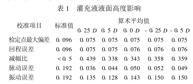 表1中“0. 25 D、0. 5 D ”等為不同液面高度 (D為壓力表外殼公稱直徑)。試驗(yàn)證明,灌充液液面高度的變化對(duì)工作環(huán)境振動(dòng)誤差影響較大。因 此,在外觀檢查中加入了對(duì)灌充液的技術(shù)要求: “壓力表表殼內(nèi)灌充液應(yīng)清潔、透明,液面高度位 于表殼中心上方0. 25 D?0. 3 D之間,且無滲漏 現(xiàn)象。”