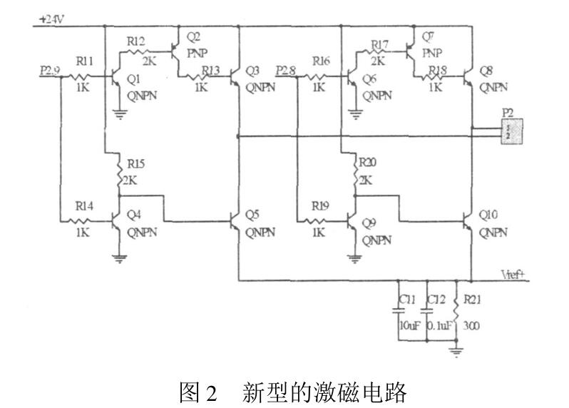為此,設計了一個新型的激磁電路,并將激勵電流 反饋到A/D轉換器,以消除激勵電流不穩定對A/D 轉換結果的影響,如圖2。