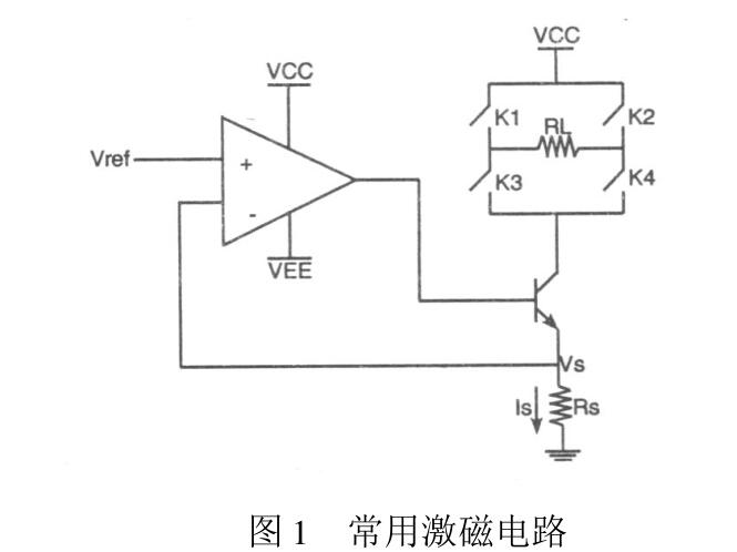 以往的激磁電路的設計都是采用恒流源和可控開 關電路組成。恒流源是由電壓基準、比較放大、控制調 整和采樣等部分組成的直流負反饋自動調節系統,常 用的激磁電路就是用串聯調整型恒流電源盒控制開關 組成的,如圖1。其中Kref是參考電壓,Rs是采樣電 阻’ Is為流過Rs的電流,就是所需的恒流,RL為電磁 流量傳感器線圈,K1、K2、K3、K4為可控開關,以達到 使線圈RL中流經正負交換的電流,對傳感器激磁。
